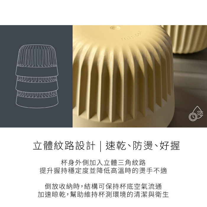 杯身立體三角紋路設計,兼顧防燙手感與快速晾乾需求,