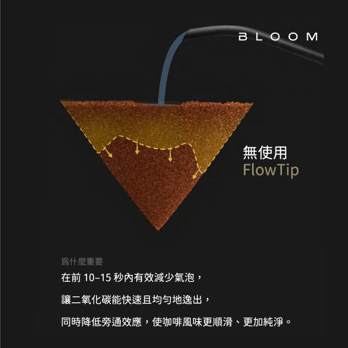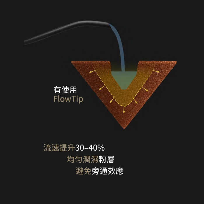 Bloom 尾端獨特的 FlowTip 設計,能在佈粉完成後於粉層中心創造完美的導流凹槽。此結構有助於注水時水流迅速且均勻地滲透,從根本上減少悶蒸階段的氣泡翻湧與通道效應 (Channeling),提升萃取穩定度。
