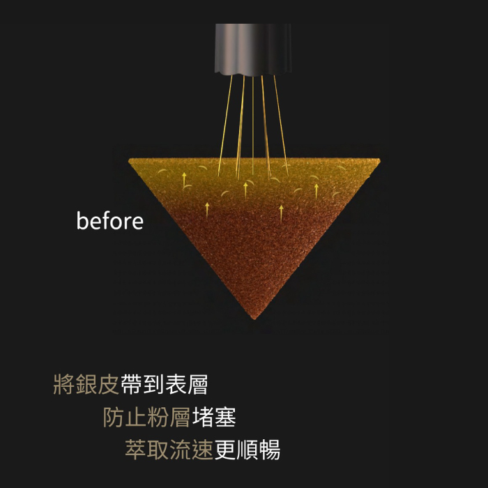 靜電吸附力比不鏽鋼高 20%:能吸附並提升細粉與銀皮,帶來更清晰的咖啡萃取