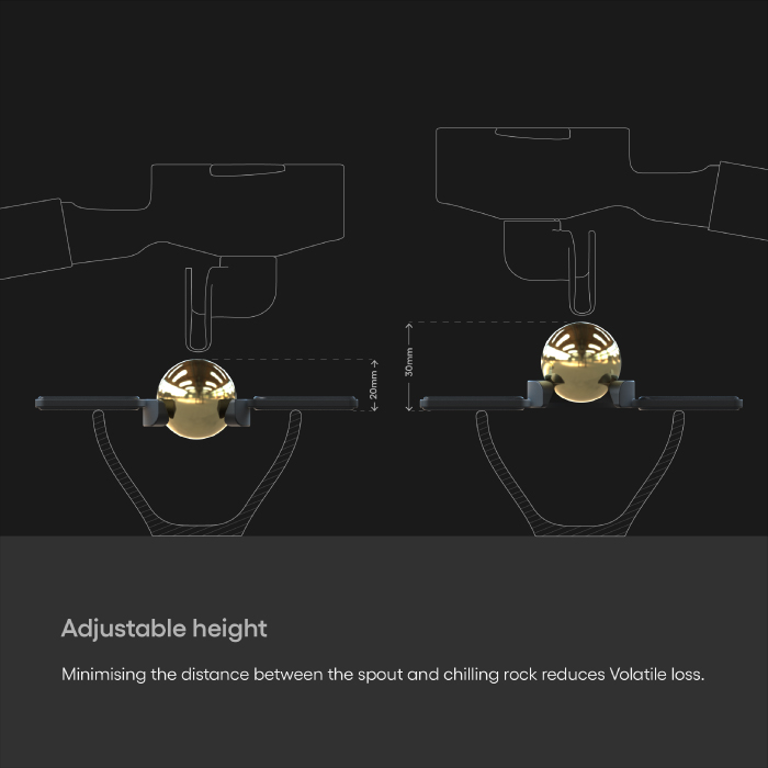 開始萃取濃縮咖啡前,將冰石置放支架上,然後至於咖啡杯口。如果冰石距離濃縮咖啡的分流嘴距離太遠,可以將支架翻面使用,選擇適當的高度。冰石距離分流嘴越近,保留揮發性芳香物質的效果越好。